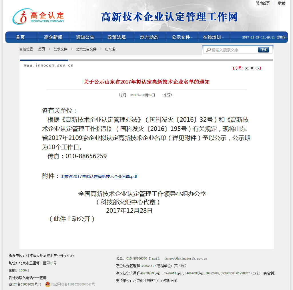 附通知鏈接:關(guān)于公示山東省2017年擬認(rèn)定高新技術(shù)企業(yè)名單的通知