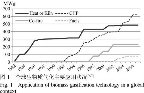 在世界范圍內(nèi),生物質(zhì)氣化主要用于供熱/窯爐、熱電聯(lián)產(chǎn)(combined heat and power,CHP)、混燃應(yīng)用和合成燃料(圖1),目前規(guī)模最大的應(yīng)用是CHP。20世紀80年代起,生物質(zhì)氣化被美國、瑞典和芬蘭等國用于水泥窯和造紙業(yè)的石灰窯,既能保證原料供給又能滿足行業(yè)需求,具有較強的競爭力,但應(yīng)用卻不多。20世紀90年代,生物質(zhì)氣化開始被應(yīng)用于熱電聯(lián)產(chǎn)、多用柴油或燃氣內(nèi)燃機,生物質(zhì)整體氣化聯(lián)合循環(huán)(biomass integrated gasification combined cycle,BIGCC)也成為研究熱點,在瑞典、美國、巴西等國建成幾個示范工程,由于系統(tǒng)運行要求和成本較高,大都已停止運行。1998年,生物質(zhì)氣化混合燃燒技術(shù)已被用于煤電廠,將生物質(zhì)燃氣輸送至鍋爐與煤混燃,目前已商業(yè)化運行。
