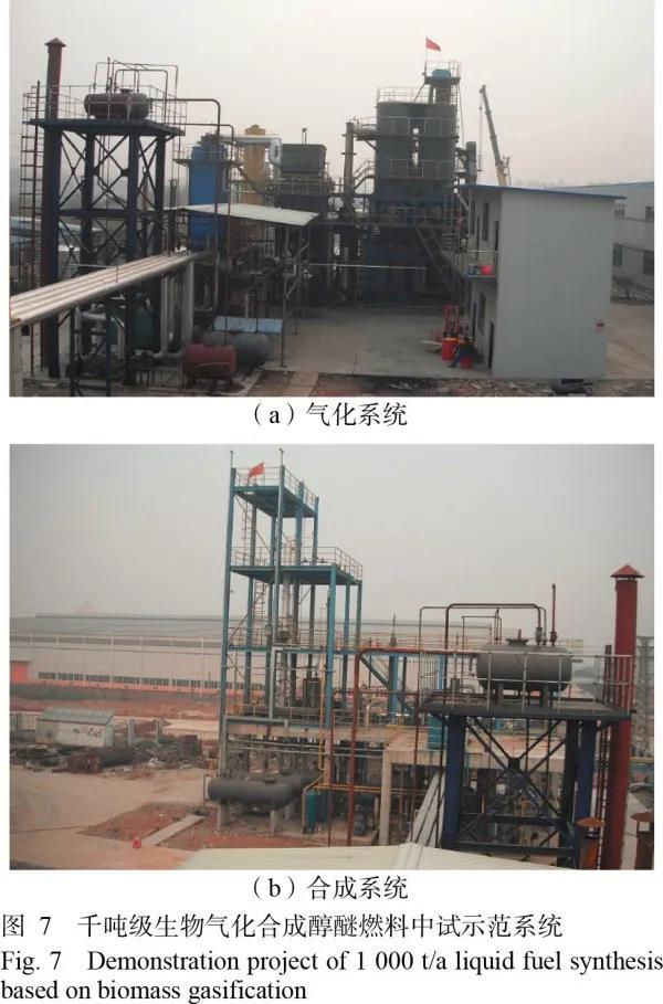近幾年,中國雖然在生物質(zhì)氣化技術(shù)上有較大發(fā)展,催化合成工業(yè)也逐漸成熟,但有關(guān)生物質(zhì)氣化合成液體燃料技術(shù)的研究尚處于起步階段,僅有河南農(nóng)業(yè)大學(xué)、浙江大學(xué)、中國科技大學(xué)、中國科學(xué)院青島生物能源與過程研究所、中國科學(xué)院廣州能源研究所等為數(shù)不多科研機構(gòu)的研究報道,產(chǎn)品主要為汽柴油、二甲醚和低碳混合醇等。廣州能源研究所在國家“十五”863計劃支持下,較早開展了生物質(zhì)氣化合成含氧液體燃料的實驗研究[75];“十一五”期間在國家863計劃、國際合作及中國科學(xué)院知識創(chuàng)新項目的支持下,建立了百噸級生物質(zhì)氣化合成二甲醚的評價系統(tǒng)和中試裝置;“十二五”期間在國家科技計劃項目的支持下,建成了千噸級生物質(zhì)氣化合成醇醚燃料示范示范系統(tǒng)(圖7),并開發(fā)出具有自主知識產(chǎn)權(quán)的萬噸級工藝包。