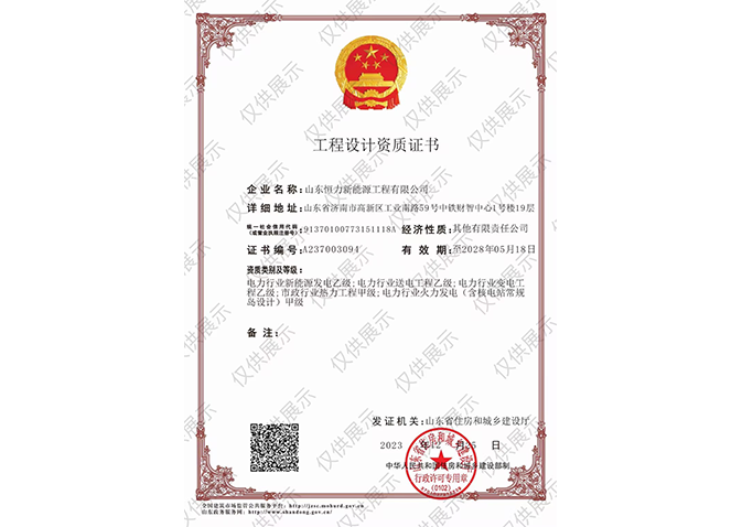 工程設(shè)計資質(zhì)證書:電力行業(yè)(火力發(fā)電(含核電站常規(guī)島設(shè)計)專業(yè)甲級;市政行業(yè)(熱力工程)專業(yè)甲級