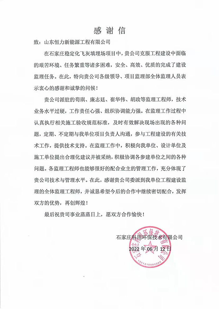近期,公司收到了一封來自石家莊項目甲方業(yè)主的感謝信,主要對我公司派駐的各位監(jiān)理工程師在工作面臨的艱苦環(huán)境、任務(wù)繁重等諸多困難,安全、高效、優(yōu)質(zhì)的完成了建設(shè)監(jiān)理任務(wù),對他們勤奮敬業(yè)、踏實務(wù)實的工作精神、專業(yè)務(wù)實的服務(wù)態(tài)度表示真心的感謝,并表示希望在今后的合作中繼續(xù)緊密配合,共鑄輝煌!
