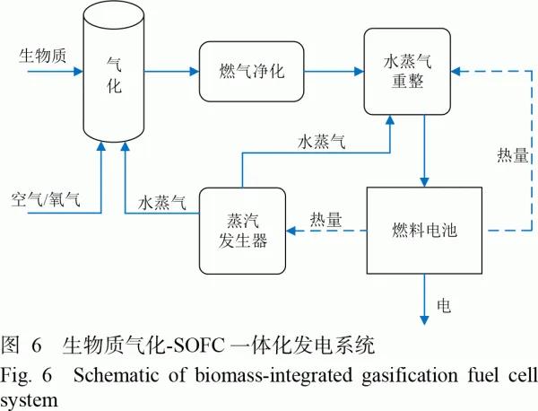 固體氧化物燃料電池(solid Oxide fuel cell,SOFC)技術(shù)突破和規(guī)?;l(fā)展為生物質(zhì)高效分布式發(fā)電提供了一條可行途徑。SOFC在高溫下直接將燃料的化學(xué)能轉(zhuǎn)化為電能,發(fā)電效率可高達60%;對燃料適應(yīng)性比較強,氣化燃氣中可燃組分(H2、CO和CH4)均可作為燃料,且發(fā)電效率不受規(guī)模影響,適合分布式發(fā)電應(yīng)用。生物質(zhì)氣化SOFC發(fā)電流程見圖6。