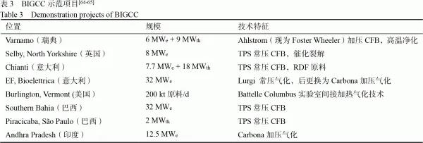 瑞典Varnamo電廠是世界上首座BIGCC電廠,發(fā)電凈效率為32%。電廠采用FosterWheeler公司的加壓循環(huán)流化床氣化技術(shù),以空氣為氣化劑,燃氣經(jīng)冷卻器冷卻至350~400℃后,由高溫管式過濾器凈化。電廠1995年開始正式運行,系統(tǒng)整體運行時間超過3600h,其中加壓氣化爐運行時間超過8500h,驗證了生物質(zhì)加壓氣化和燃氣高溫凈化系統(tǒng)的可行性,獲得了寶貴的運行經(jīng)驗。由于運行成本過高,該項目于2000年停止運行。其他BIGCC示范項目見表3,有四個項目采用了瑞典TPS的常壓CFB氣化技術(shù),這些示范工程目前都已停止運行。